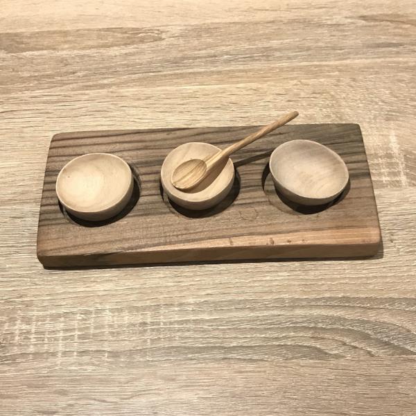 Planche à épices fait main, en noyer. Vendu avec ses accessoires.